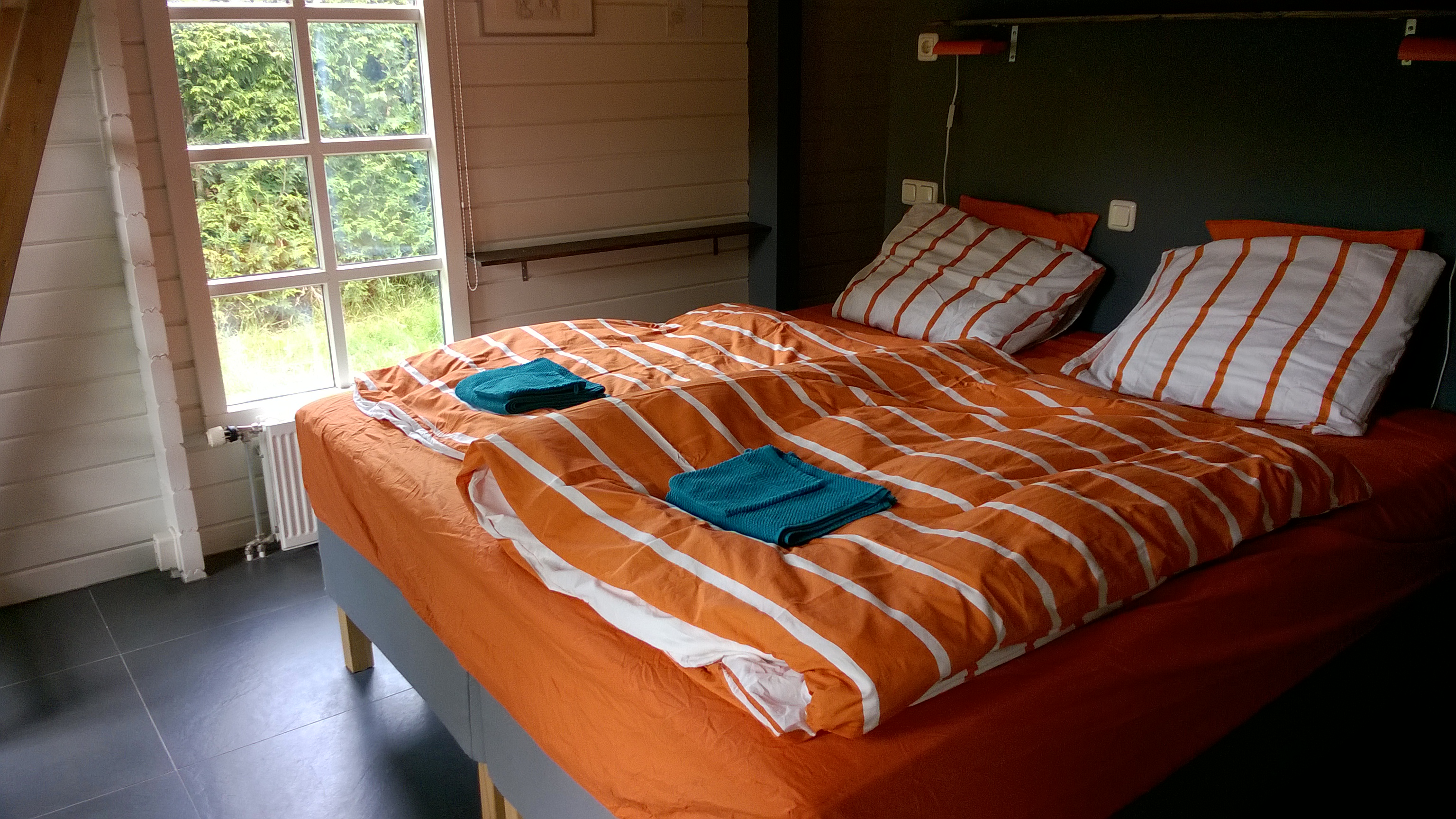 De slaapkamer heeft een groot tweepersoonsbed (ook te scheiden) en daarboven een knusse vliering met een bedbank die twee eenpersoonsmatrassen bevat, bijvoorbeeld geschikt als slaapplaats voor kinderen.